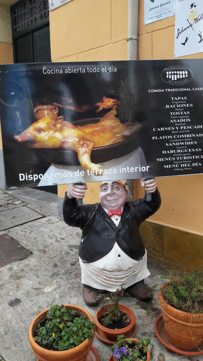 Além disso, outra coisa que deve ser provada é o prato típico de Segovia: o famoso Cochinillo, um porco assado que é muito saboroso. Na nossa ida, encontramos um restaurante muito agradável em que o prato individual era 13 euros (e que compartimos em 3 pessoas por motivos já citados anteriormente).