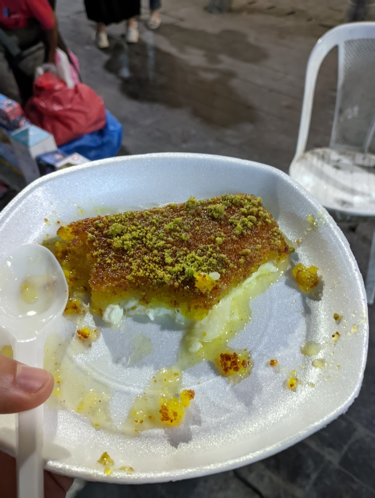 Como sobremesa, nada bate o kunafeh, um doce feito à base de semolina, com caramelo por cima e muito queijo por baixo. Em Amã, inclusive, há um lugar super famoso que serve o doce, o Habibah Sweets. A fila do lugar é sempre grande, mas o serviço é muito rápido, então recomendo a experiência. É um doce muito bom mesmo (e olha que nem gosto de doce geralmente).