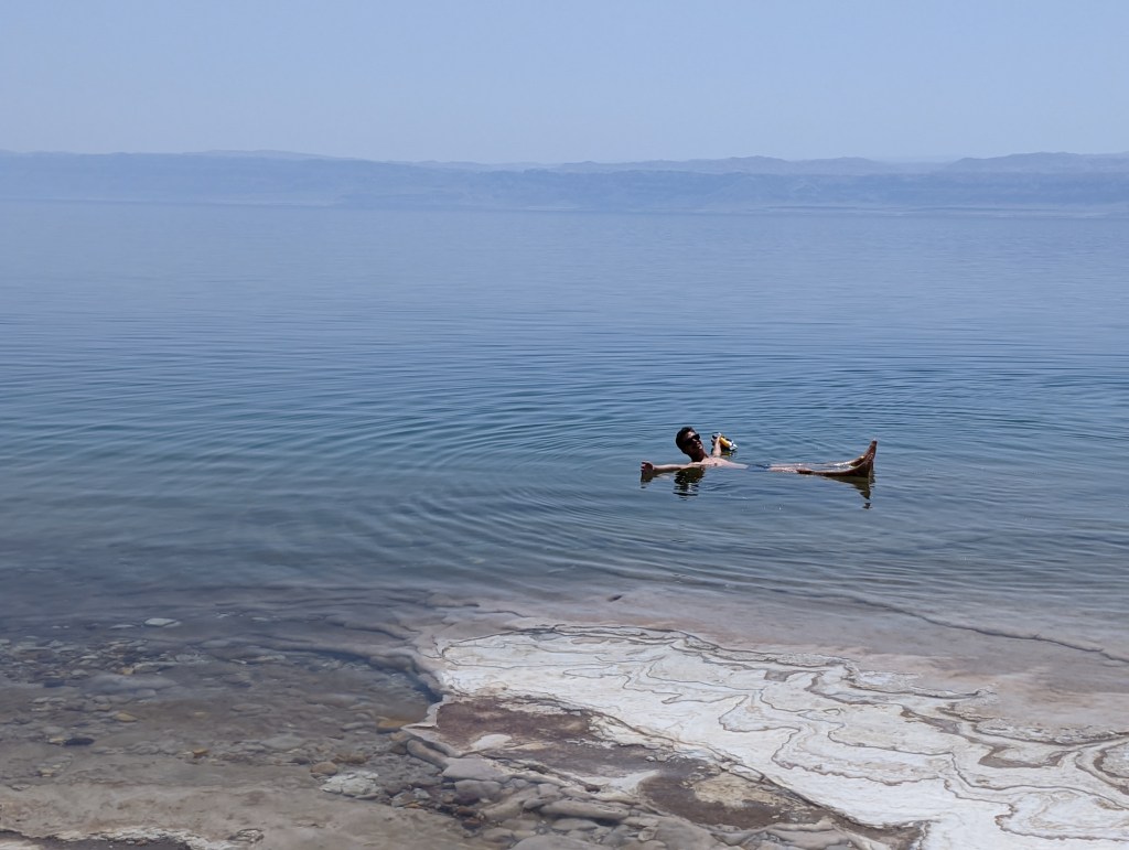 (tentar) Nadar no Mar Morto é uma experiência muito esquisita. Como a água é muito salgada, sua densidade é enorme, então o corpo humano flutua sem o mínimo esforço. Além disso, sua consistência é bastante estranha, parecendo meio pegajosa. De qualquer maneira, tenho que admitir que é uma experiência que vale muito a pena, já que é algo muito diferenciado. Ou seja, mesmo sendo caro e sendo uma atração mega turística, é algo que se deve fazer ao visitar o país.