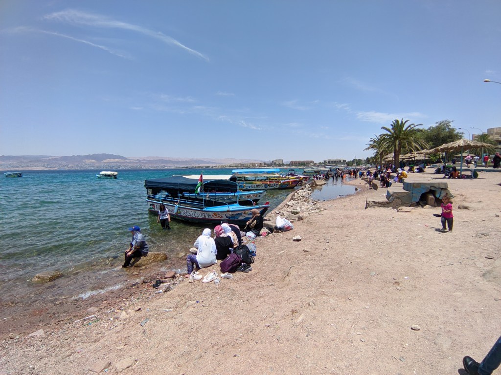 Aqabou (desculpa pelo trocadilho) sendo uma cidade bastante normal, sem muitas atrações imperdíveis e com praias muito ordinárias, nada de especial. Para falar a verdade, o que mais gostei em Aqaba foi de ver como as famílias locais curtem a praia: homens com roupas de banho normais, enquanto as mulheres usam burkini, todas cobertas. Foi bem interessante de se ver.