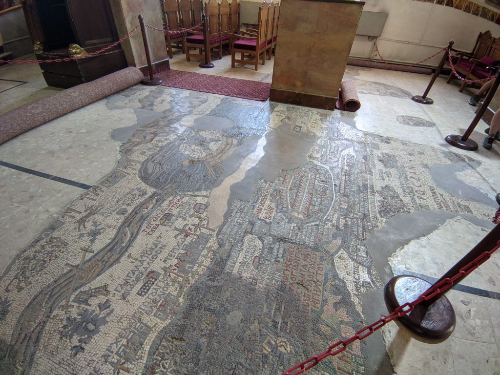 Além de contar com uma das maiores comunidades cristãs da Jordânia, que convivem em harmonia com os muçulmanos, Madaba tem também um tesouro muito bem guardado: o mapa mais antigo da região da Palestina. Datado do século 6, esse mapa é um belo mosaico localizado no chão da Igreja de São Jorge, no centrinho da cidade. É impressionante observar como o mapa é bastante preciso, além de ser surpreendente o seu estado de conservação. Sem dúvidas, uma das belas e aleatórias surpresas que a Jordânia oferece aos turistas.