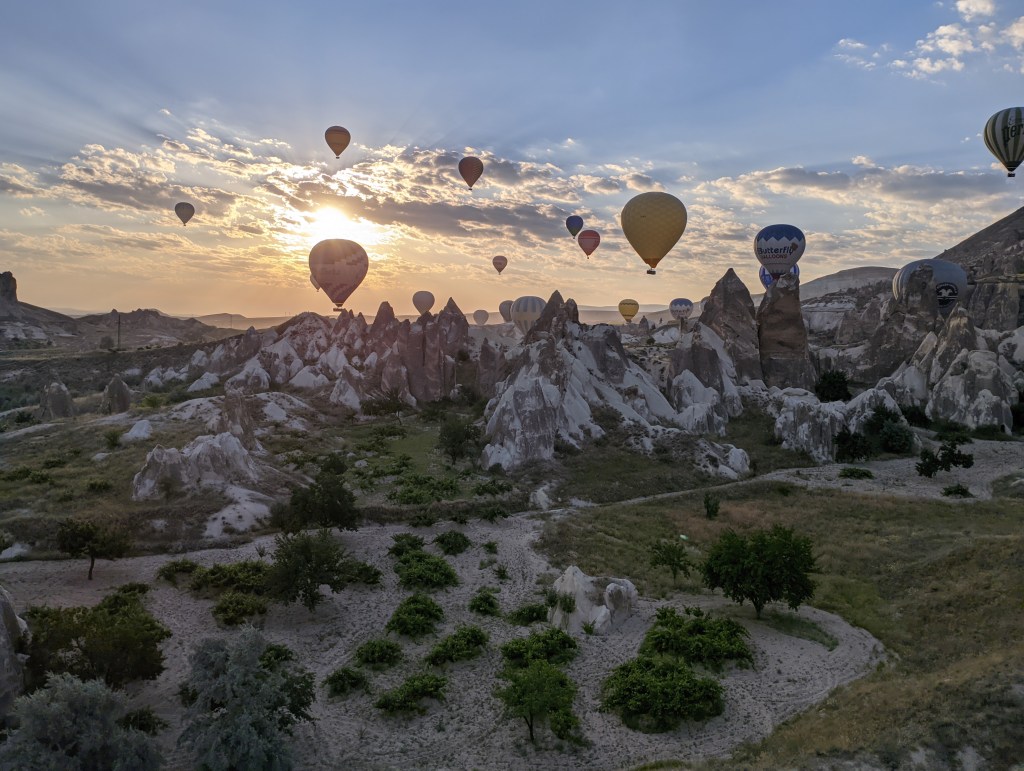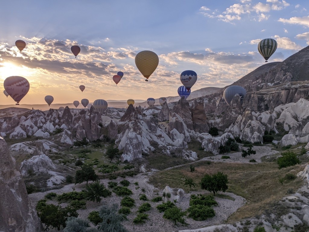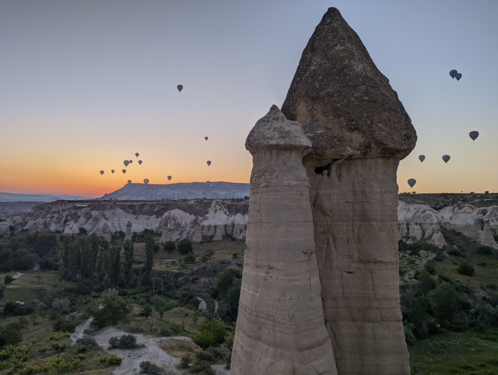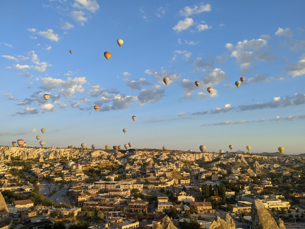 Foi o primeiro dia de atividades propriamente dito na Capadócia. Como todos os passeios de balão têm como objetivo ver o nascer do sol, isso significa que todo mundo acorda super cedo lá – e não foi diferente comigo.