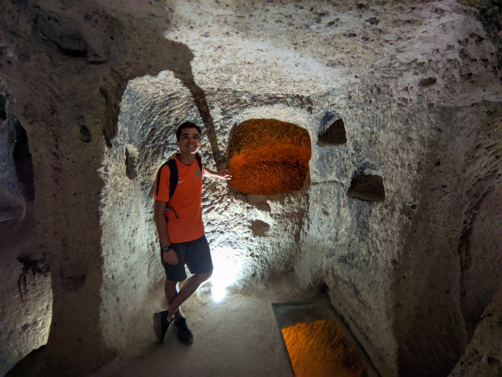 Para fechar o dia super produtivo, ainda deu tempo de visitar a cidade subterrânea de Kaymakli, a mais antiga das cidades subterrâneas da Capadócia. Com pelo menos 4 andares abertos ao público, Kaymakli é um emaranhado de túneis mais ou menos estreitos que eram usados pela população local por séculos como moradia. É um lugar realmente impressionante e dá para ver as diversas casas que existiam ali, além de igreja, estábulos, cozinhas e por aí vai.