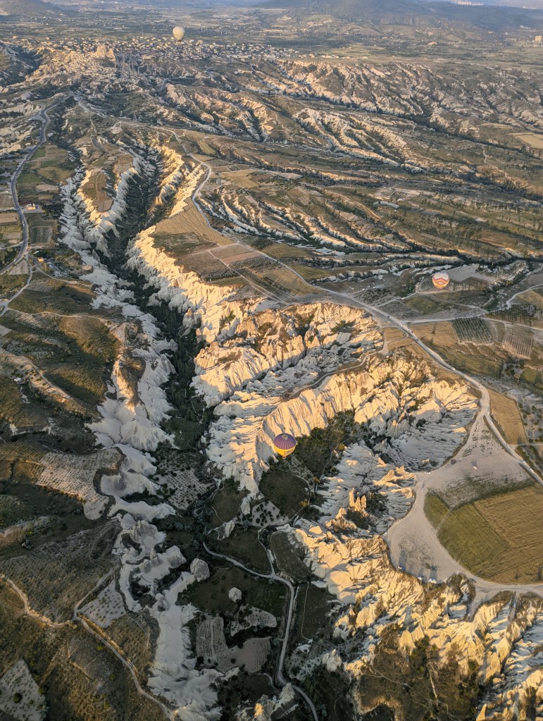 Depois de decolar, o balão fica no ar por mais ou menos uma hora, passando por diversos vales e sobrevoando toda a linda região que eu havia visitado nos dias anteriores. A vista, com centenas de balões voando, e todas essas formações, não tem preço.